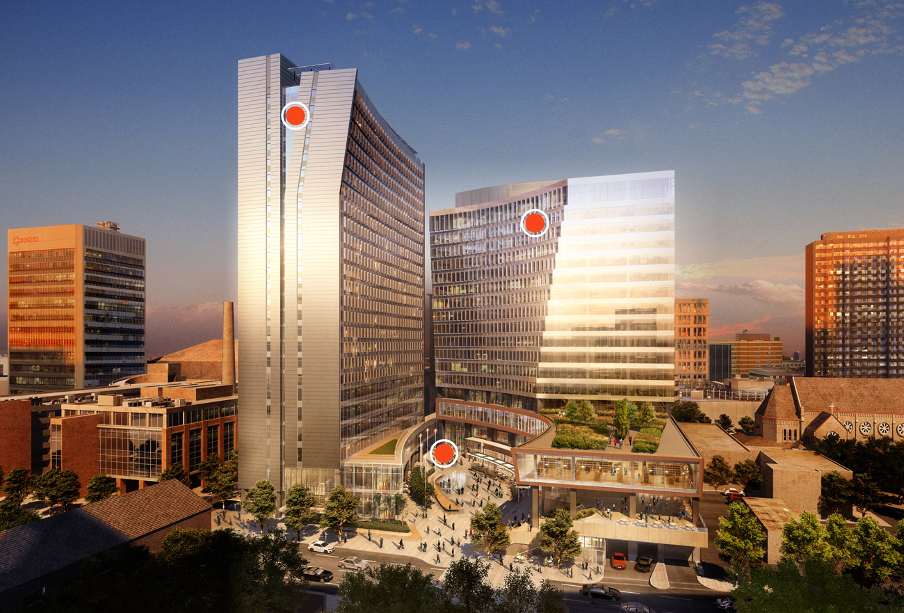 The plaza space between the two towers has been thoughtfully designed for the enjoyment of residents, tenants, and visitors alike. It features landscaping, benches, a water feature, and grand staircase. Planned to maximize sunlight and protect from winds, the plaza is intended to be used daily as well as accommodate a host of exciting events.