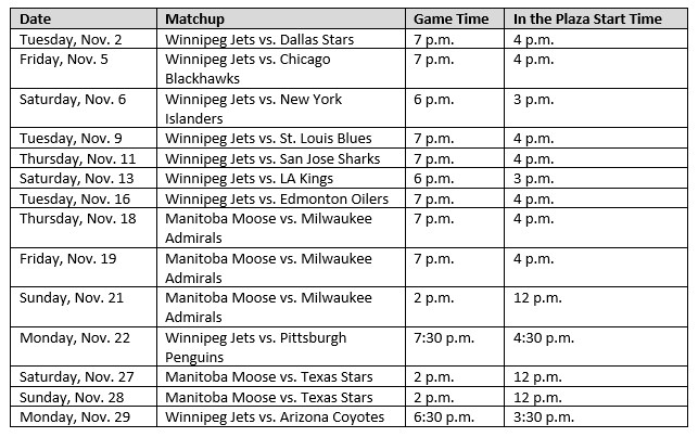Starting Tuesday Nov. 2 and for all Winnipeg Jets and Manitoba Moose home games in November, the plaza at True North Square will feature a series of exciting pre-game activations for everyone, from live deejays and hockey “hot stoves”, to cultural performances, and giveaways. Fans can meet Mick E. Moose and Benny and those in attendance can enter a contest to win an autographed Jets or Moose jersey at each event.